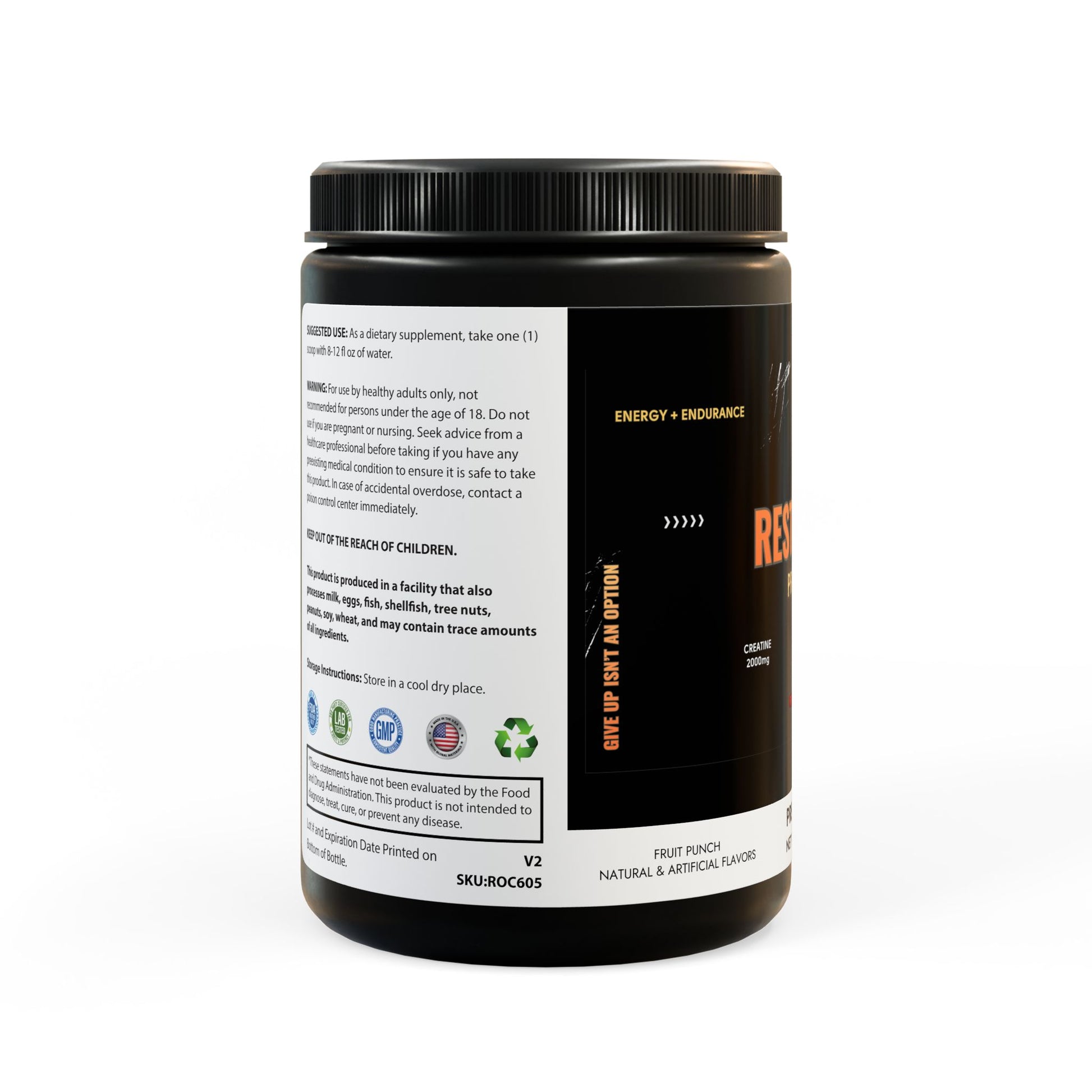 Ingredients: Vitamin B3 (as Niacinamide), Vitamin B6 (as Pyridoxine HCl), Vitamin B9 (as Folic Acid 97%), Vitamin B12 (as Methylcobalamin), Choline (from Choline Bitartrate), L-Citrulline DL-Malate 1:1, Creatine Monohydrate, N-Acetyl Tyrosine (NAT), Dimethylaminoethanol, DL-Bitartrate (DMAE), L-Theanine, Caeine Anhydrous, Black Pepper Extract. Other Ingredients: Silicon Dioxide, Malic Acid, Naturally & Articially Flavored, Citric Acid, Sucralose, Acesulfame Potassium.